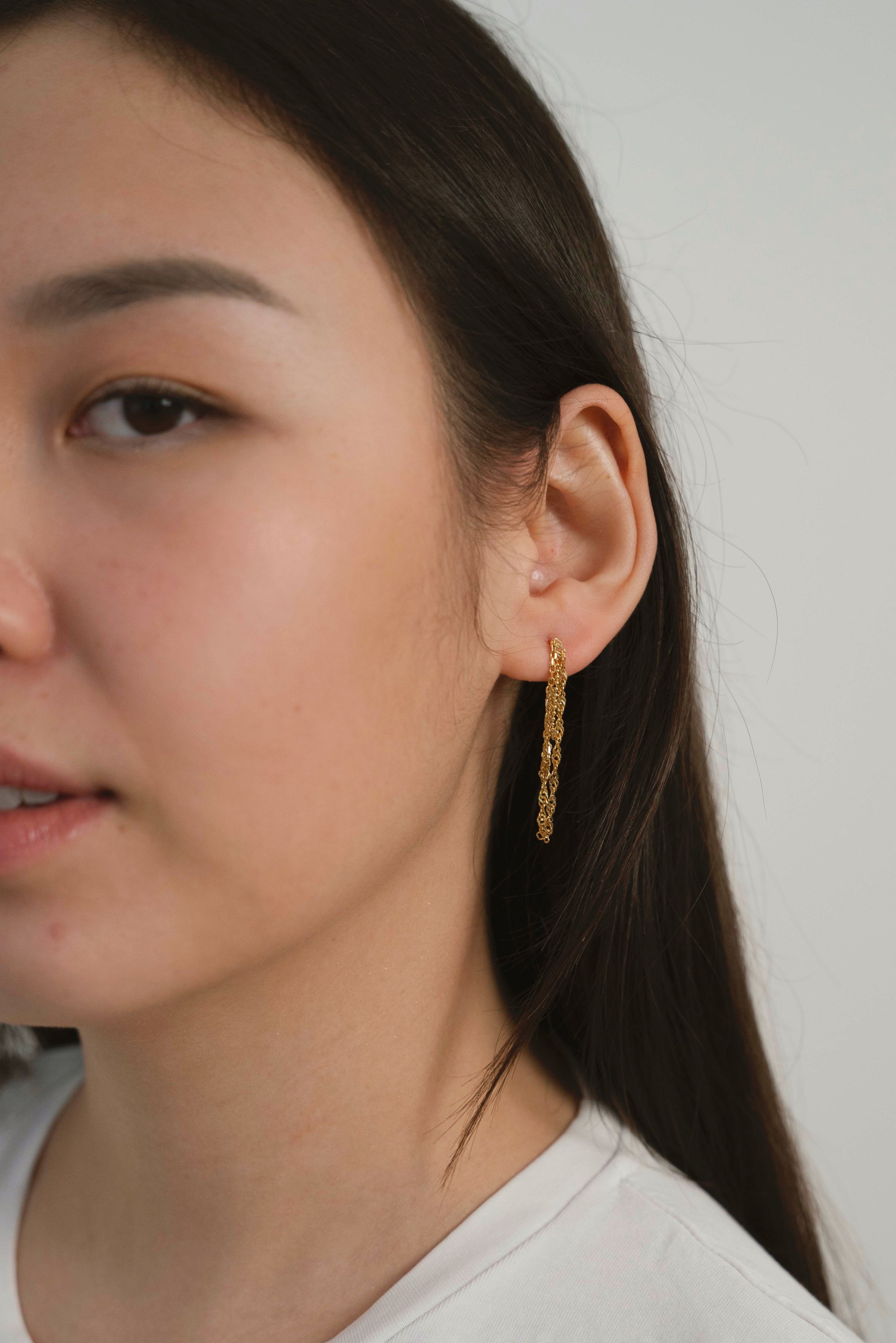 Elevate your style with our Echelon Earrings, a mesmerizing blend of sophistication and subtle detail. These mid-length stud earrings exude modern elegance, featuring three rows of hanging chains that gracefully cascade from the front to the back. Each row showcases a distinct chain style, a captivating detail revealed only upon closer inspection. Crafted from high-quality 925 sterling silver and luxuriously plated with 14k gold, these earrings offer a timeless allure with a contemporary twist. Make a statement with the understated glamour of the Echelon Earrings, designed to effortlessly elevate any ensemble.
