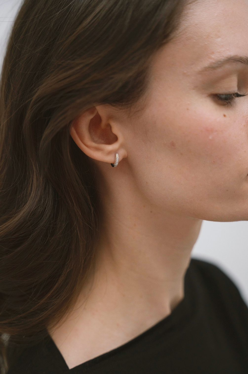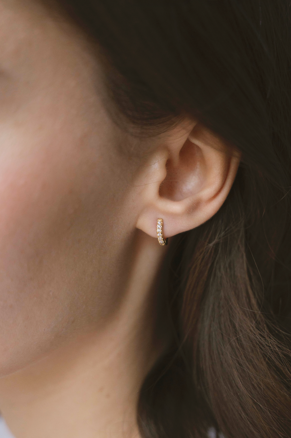 Our Snuggies earrings are small 10mm hoop earrings with 3 rows of tiny cubic zirconia stones, one row on each side, sparkling beautifully from every angle.