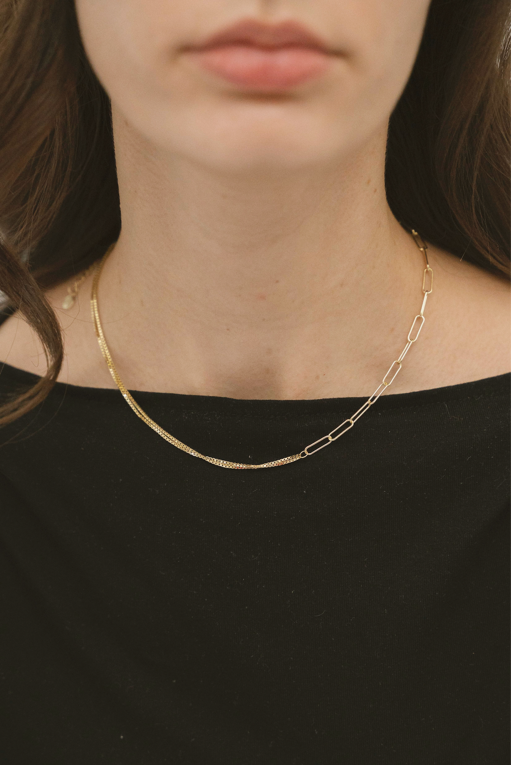 Look like an elegant muse with our Paperclip Mix necklace. This classic looking statement piece consists of one half paperclip chain and one half two-line box chain.