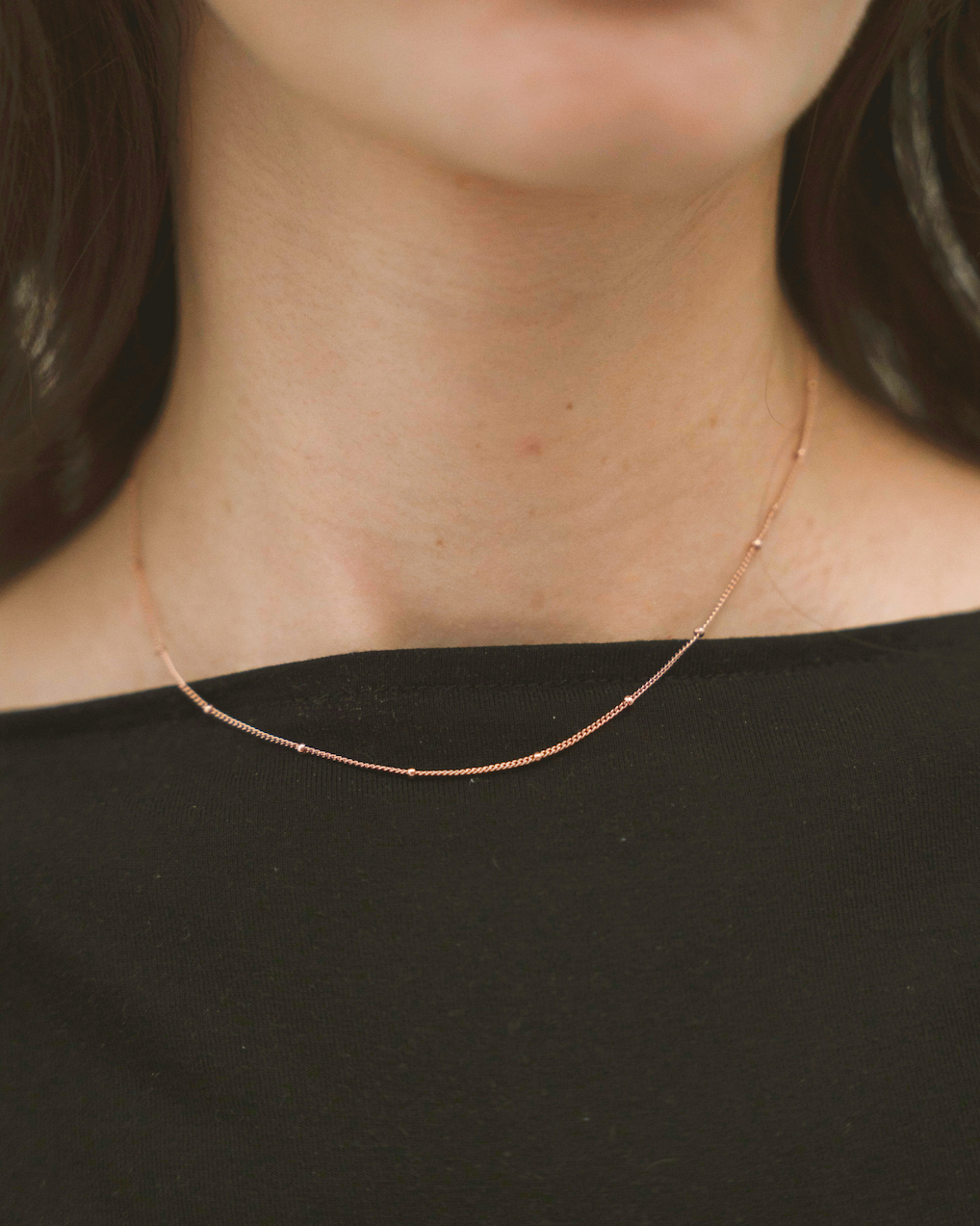 925 sterling silver rose gold plated simple dotted chain necklace. Can be worn solo for a simple look or also works perfectly as a dainty layering necklace.