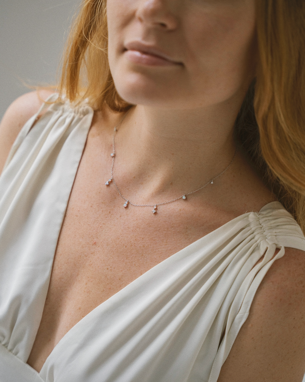 Embrace celestial charm with our Stellar Necklace, a delicate adornment that exudes elegance and grace. Crafted to perfection, this dainty silver necklace features a captivating design, with alternating opal and white cubic zirconia charms delicately fixated along the chain.
