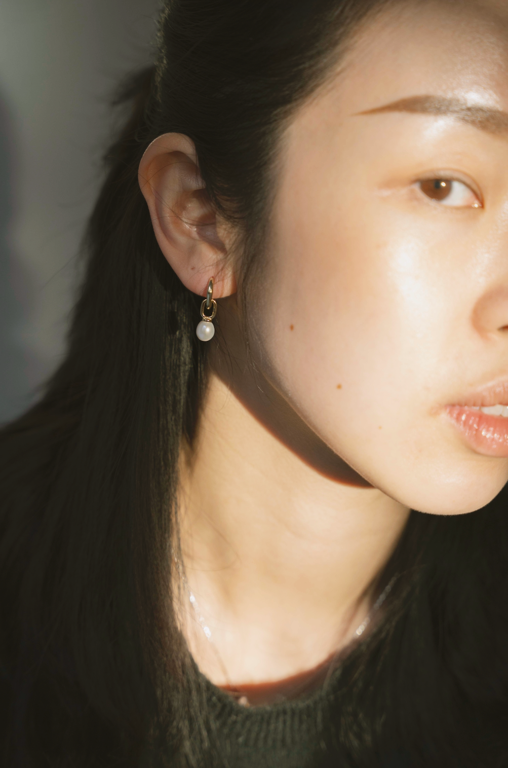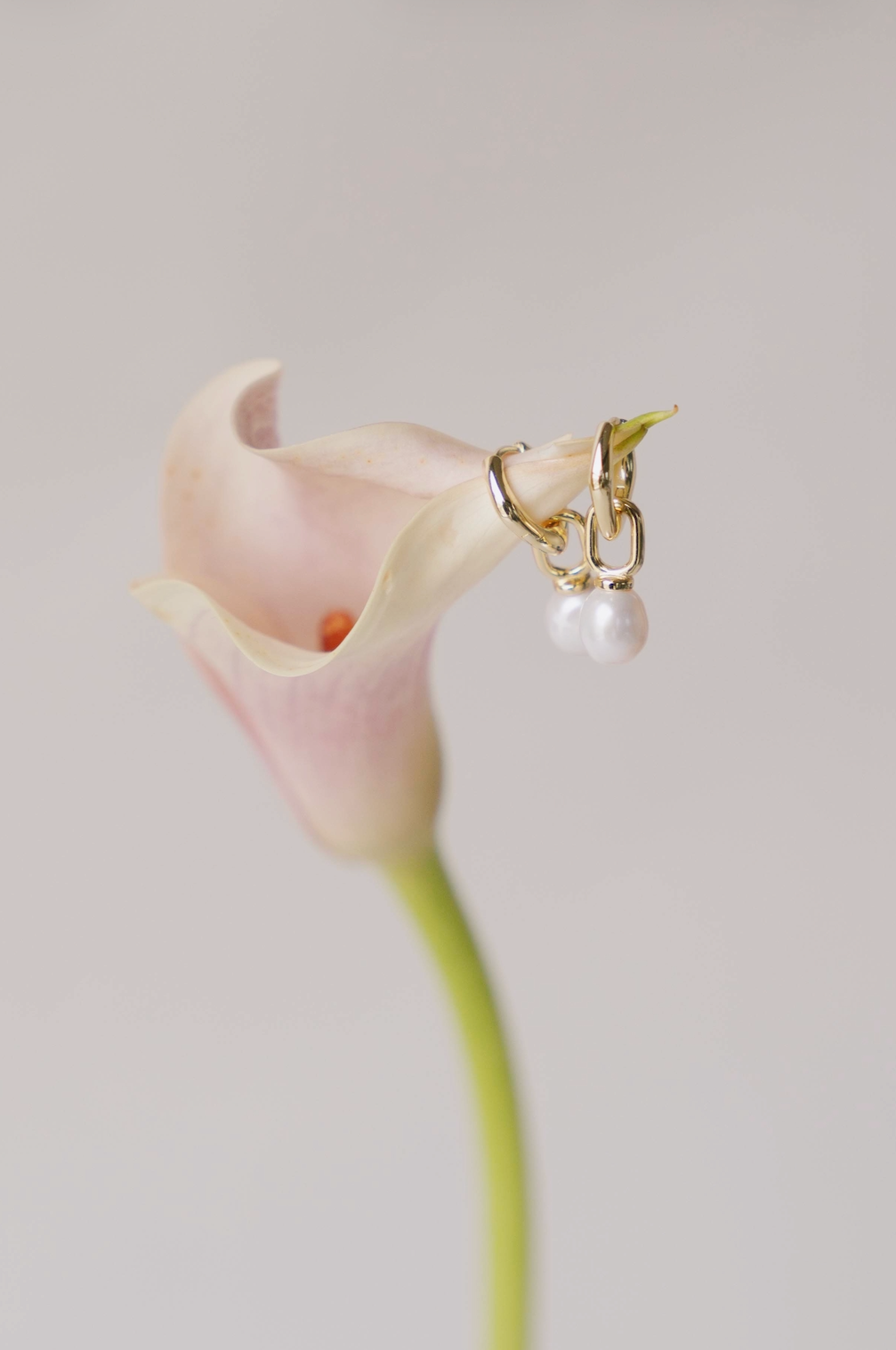 The Opus earrings are beautiful mid-length pearl hoops with a freshwater pearl charm dropping down. The pearl can be easily taken off the hoop, if desired.