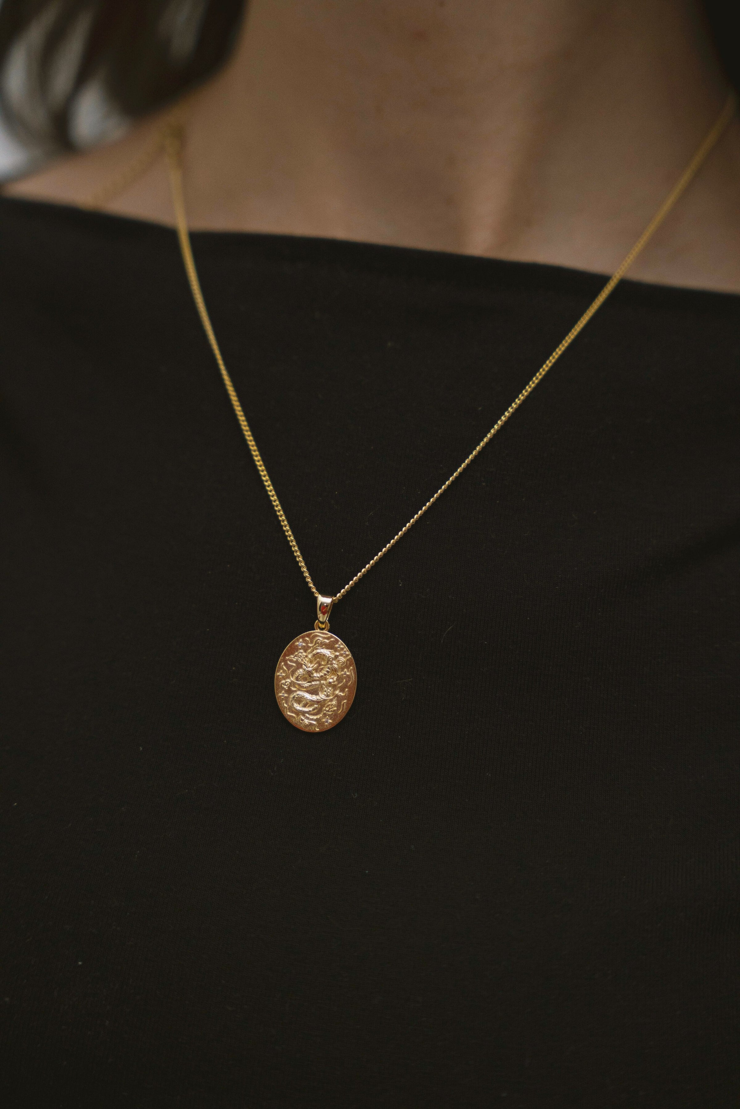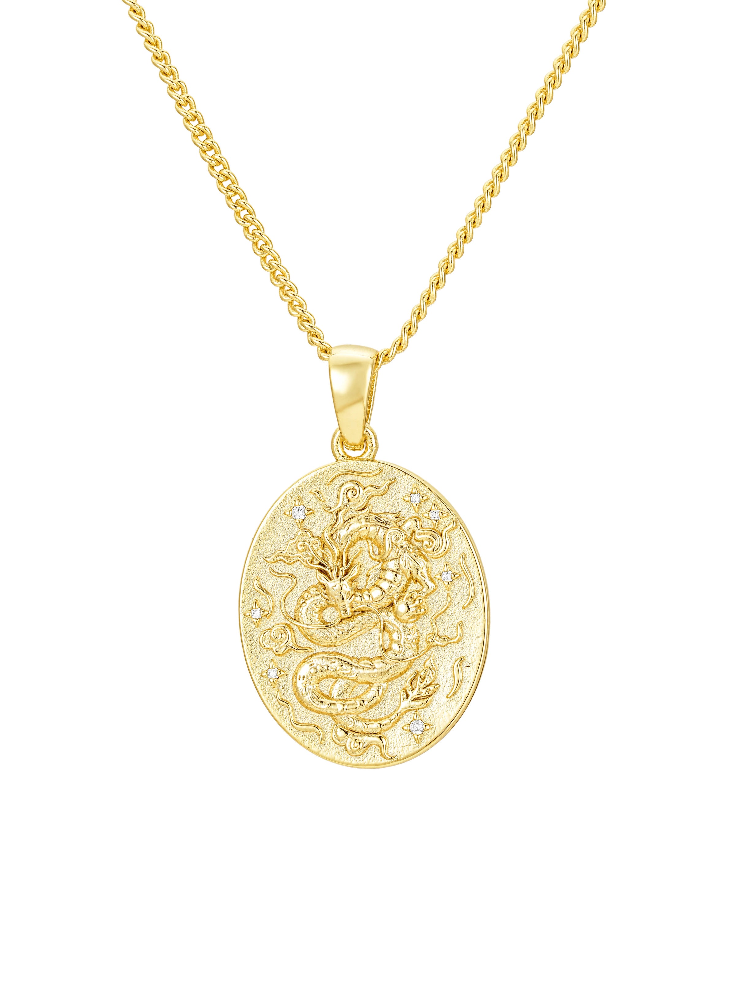 This Dragon Necklace features an intricately detailed dragon motif on a luminous oval medallion, crafted from 925 sterling silver plated in 14k gold for a rich, enduring shine. The sculptural dragon is surrounded by subtle star-like accents, adding depth, texture, and a touch of celestial charm.