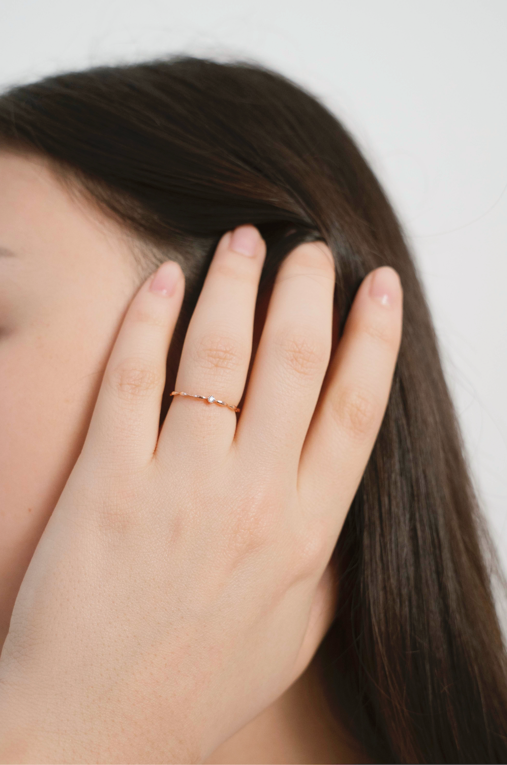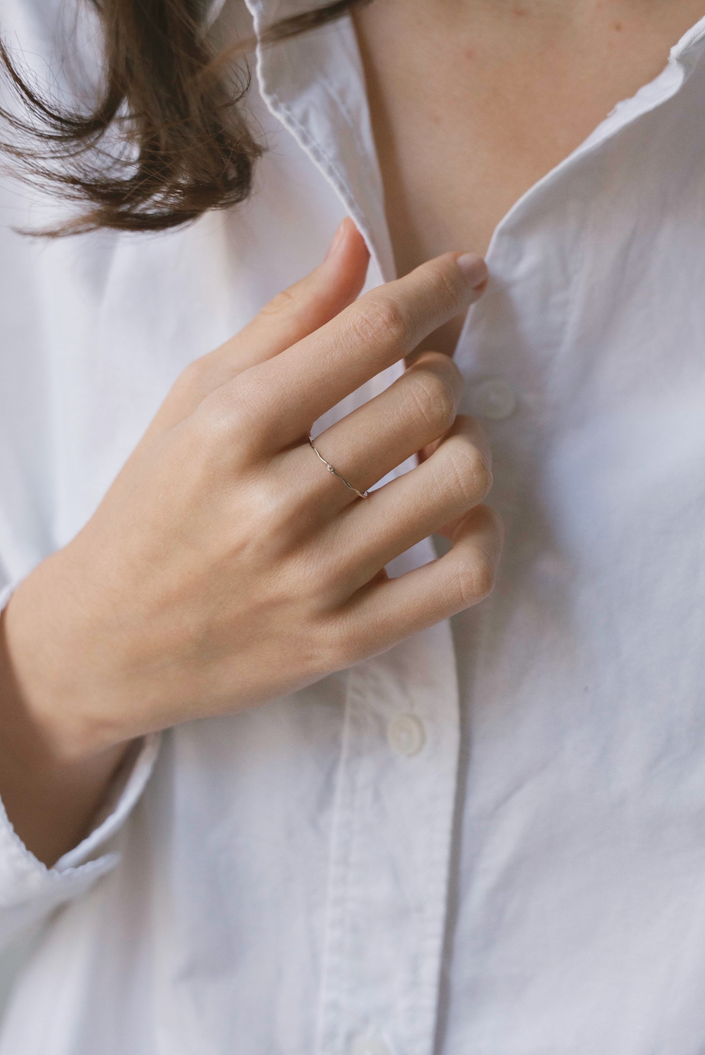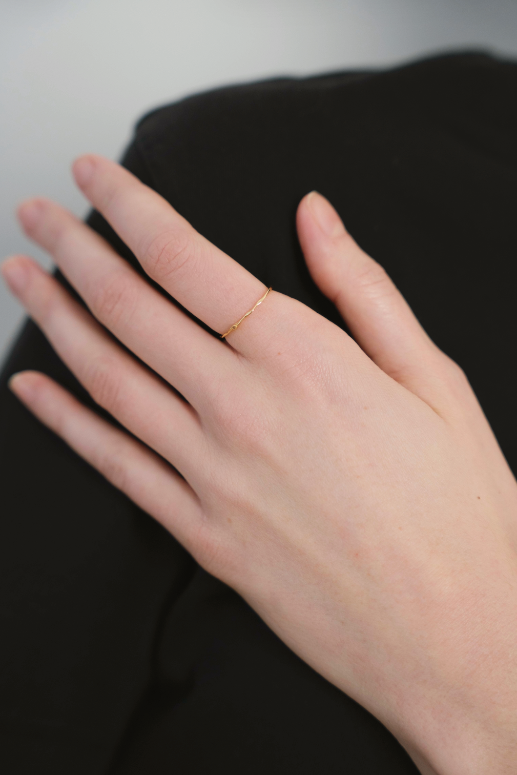 The Wavy ring has a super minimalistic design. Looking from the top you’ll see a teeny tiny cubic zirconia shining from the middle and two thin waves extending to both sides.