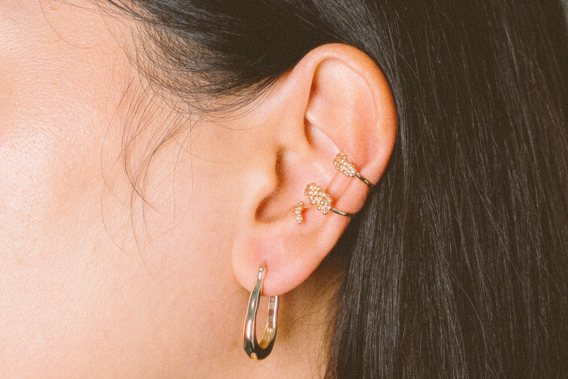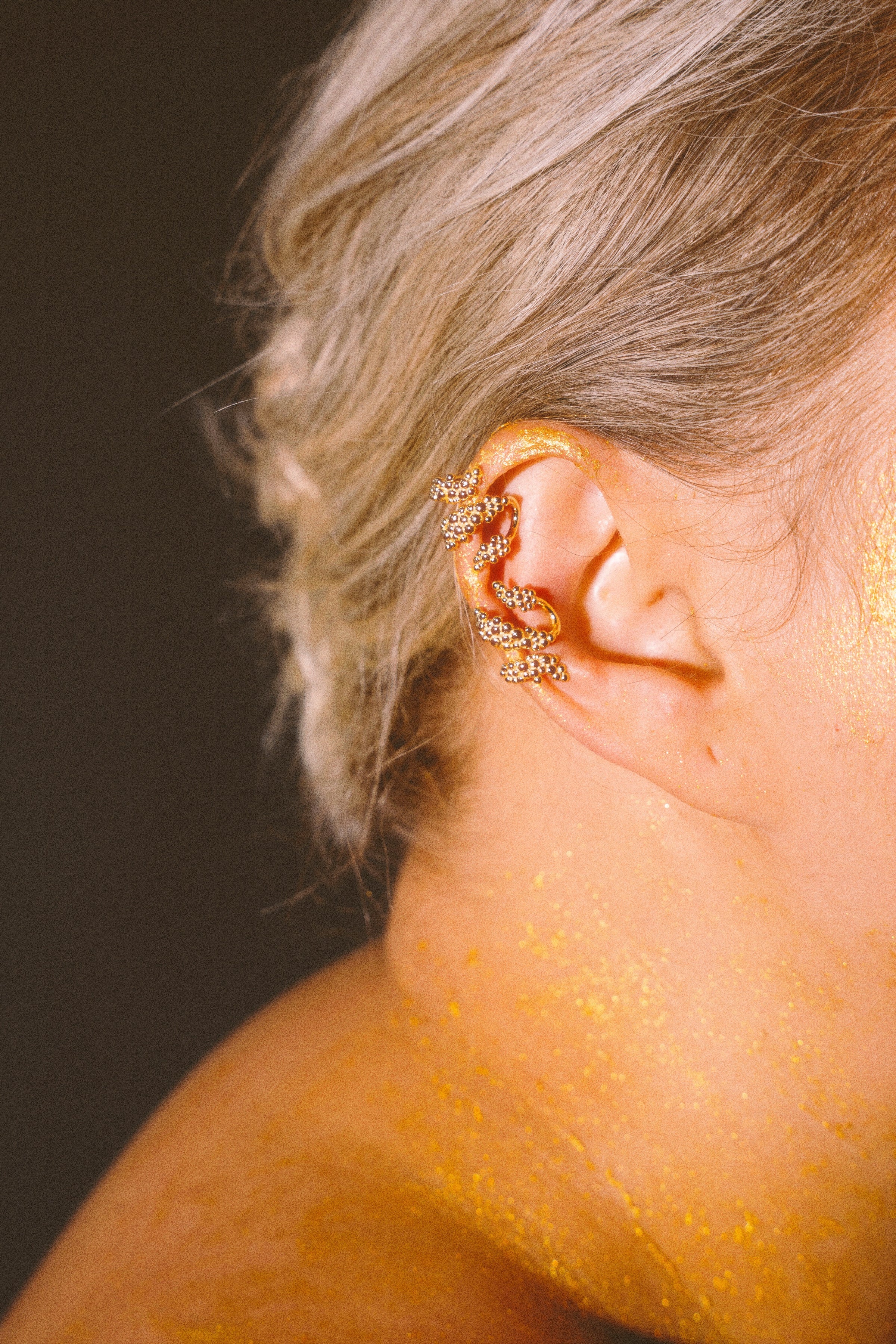 The SPHORA Earcuff is an avant-garde statement — its spheroid, intricate design wraps the ear with a sense of movement and modern elegance. Artful yet wearable, it channels a fearless, sculptural chic that feels both powerful and refined.